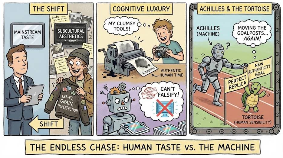 It is crucial, however, to note that these aesthetic oases are, by their nature, provisional and based on a completely arbitrary class of signs. The relationship between technological advancement and human taste follows the paradox of Achilles and the tortoise: every time the machine (Achilles) seems to have bridged the gap by perfectly replicating a style, human sensibility (the tortoise) has already arbitrarily moved the goal of authenticity one step further. It is not an absolute value, but an endless chase towards a new area of intact humanity, defined not by what we are, but by what the machine is not yet